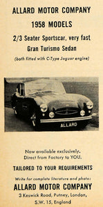 This is a small original 1958 black and white print ad for the Allard Motor Company, featuring the Gran Turismo Sedan Sportscar with C-Type Jaguar Engine. The Allard Motor Company is located at 3 Keswick Road in Putney, London, England.