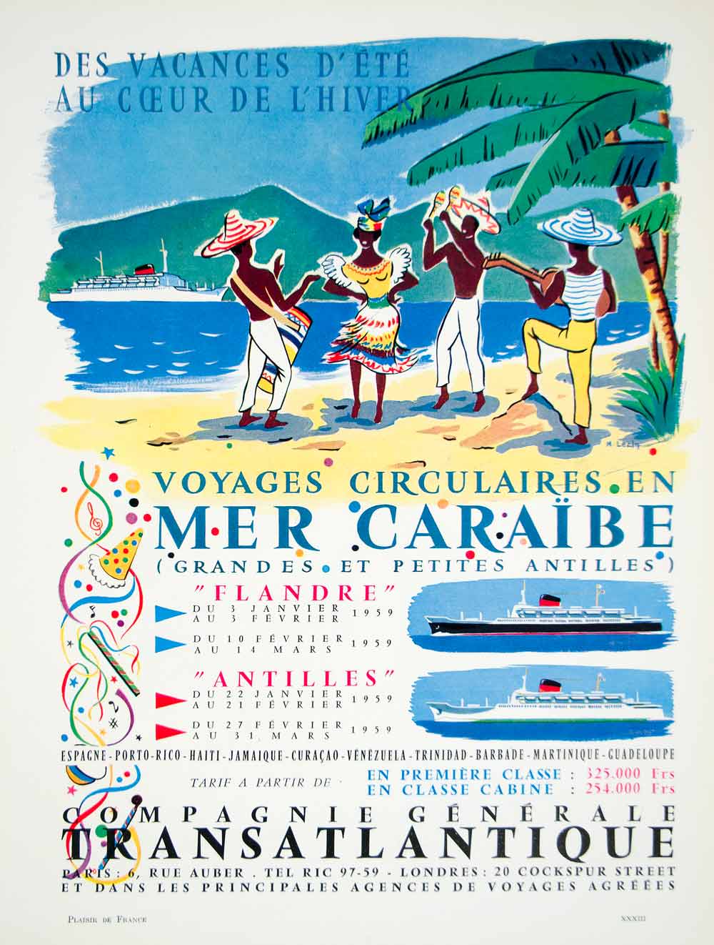 This is an original 1958 color print ad for "summer vacation in the heart of winter." This ad is for Caribbean cruises from the General Transatlantic Company in France.