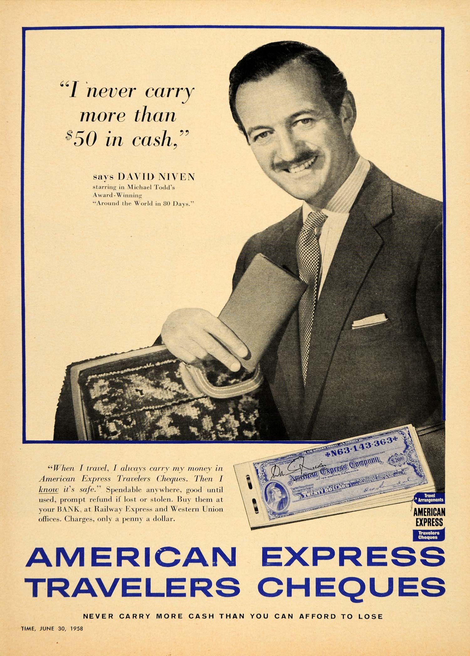 Keywords specific to this image: Money, Cash, Safekeeping, Travel Planning, Around the World in 80 Days, Michael Todd, Railway Express, Travel Expenses Vintage Advertising
