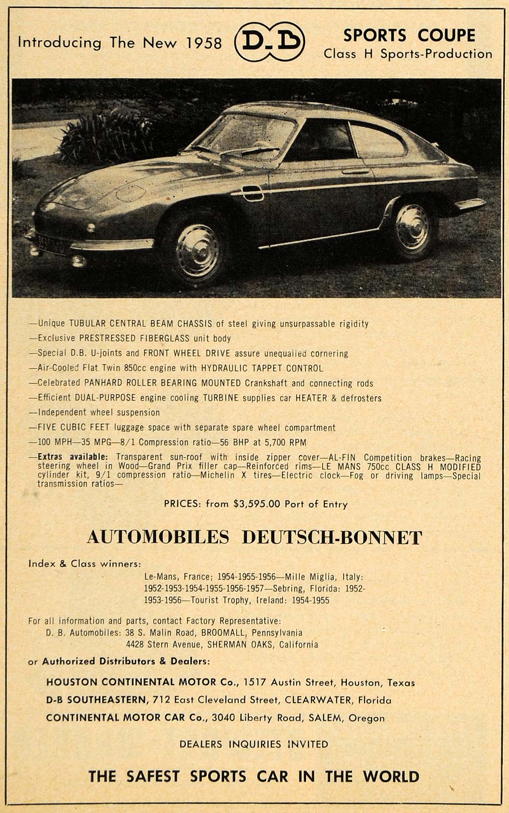 Keywords specific to this image: Vintage Advertising, Vintage Sports Cars, Imported Cars, European Cars, Foreign Cars, Specifications, Features, Flat Twin 850cc Engine, Tubular Central Beam Chassis, MPG, MPH, Continental Motors