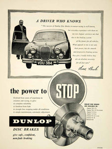 This is an original 1958 black and white print ad for Dunlop disc brakes that features an endorsement from Formula One race car driver Ivor Bueb (1923-1959), who installed the parts on his 1958 Jaguar XK150 two-door coupe sports car.