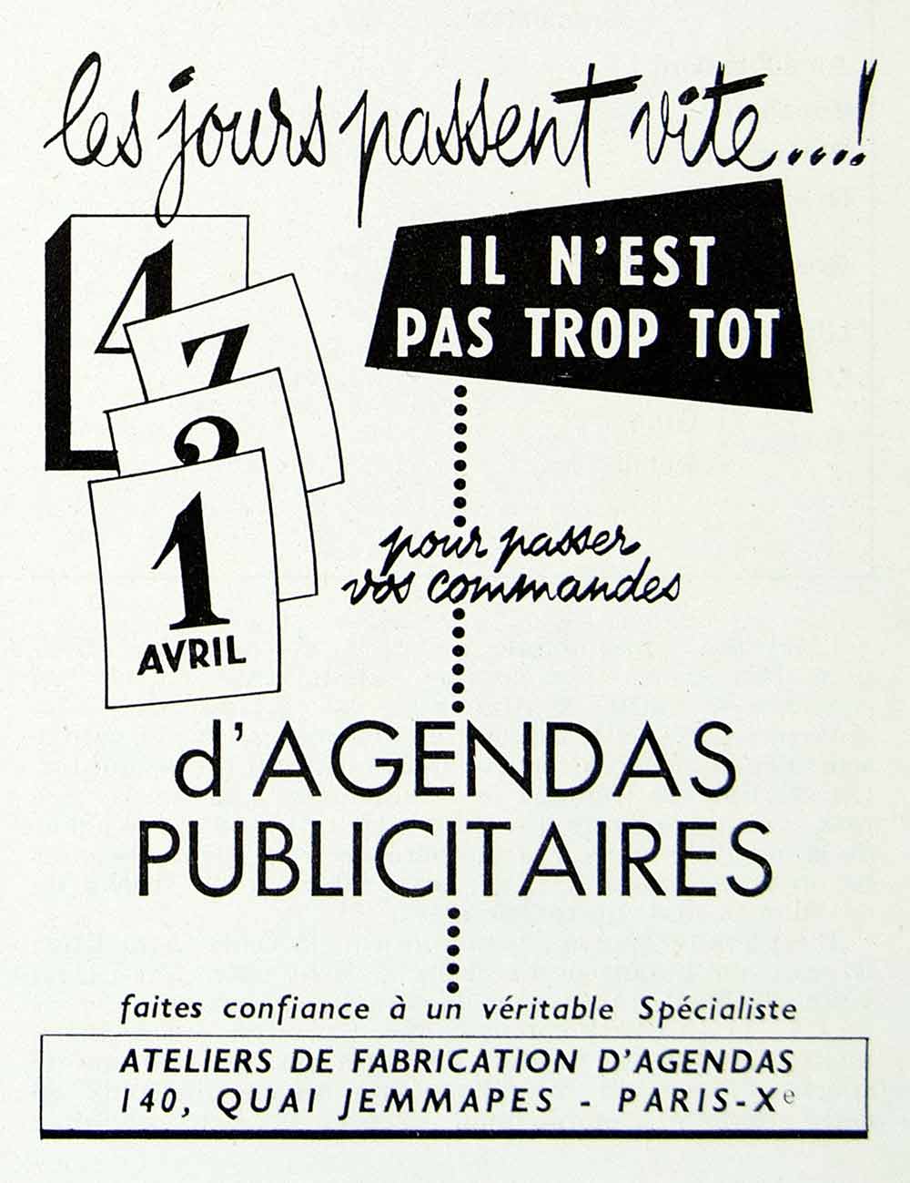 This is an original 1958 black and white print ad for agendas made by the Ateliers de Fabrication d'Agendas located at 140 Quai Jemmapes, Paris.