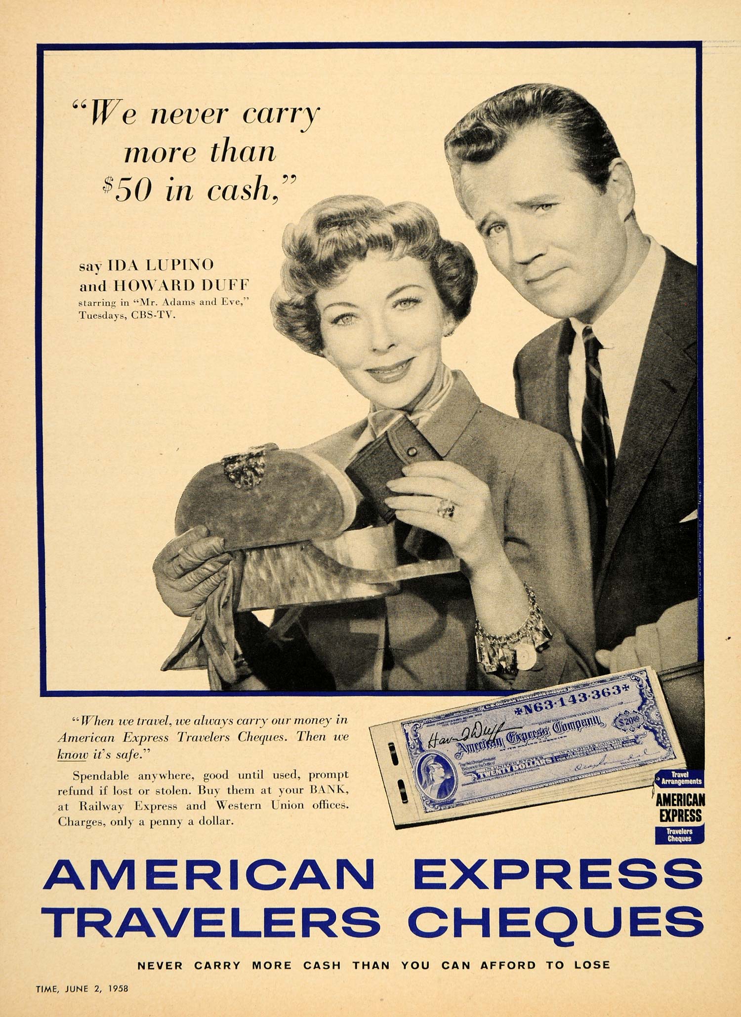 Keywords specific to this image: Ida Lupino, Mr. Adams and Eve, CBS, Cash Safekeeping, Money, Travel Expenses, Travel Planning Vintage Advertising