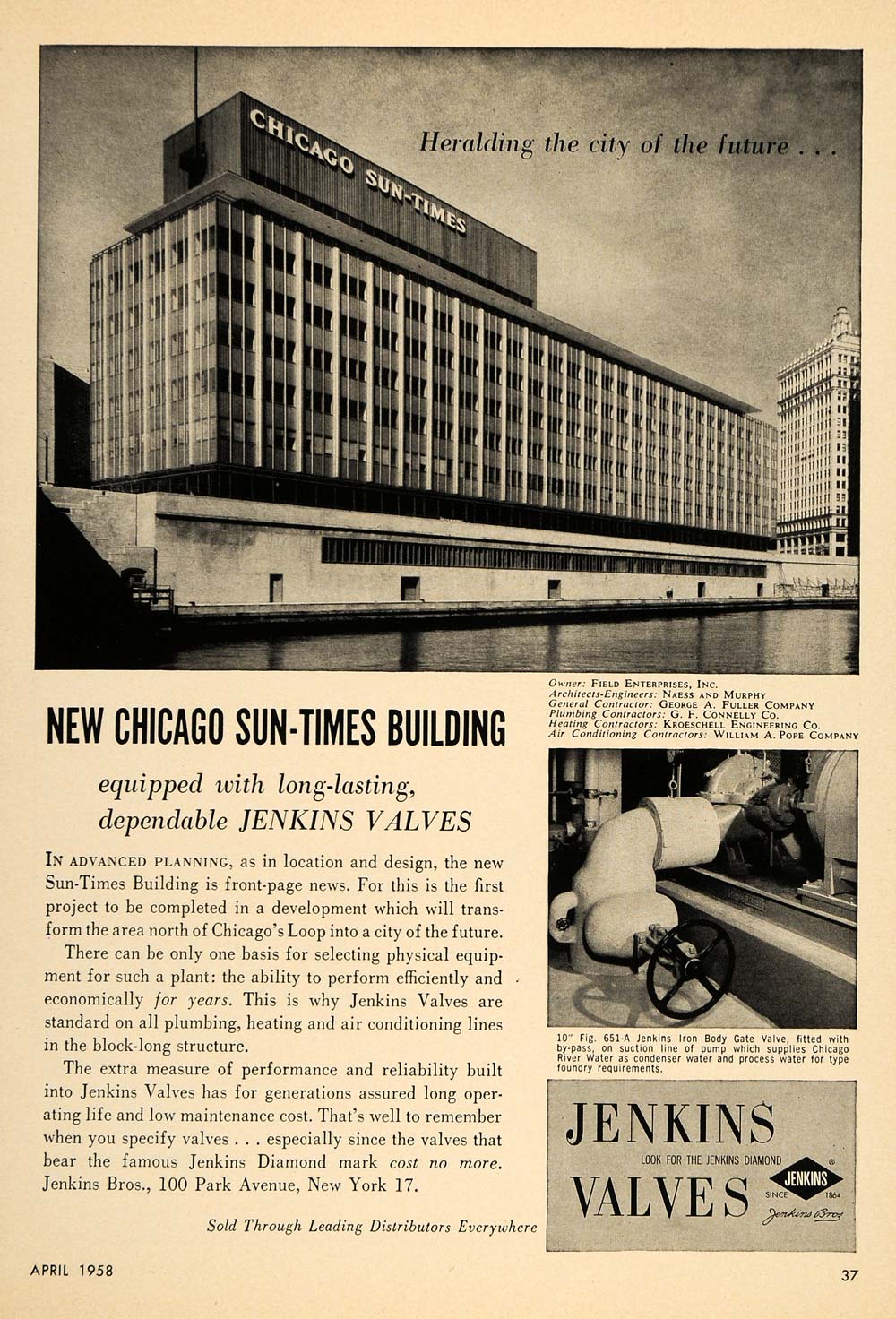 This is an original 1958 black and white print ad for the Jenkins Bros., located at 100 Park Avenue in New York. This ad features the Chicago Sun-Times Building that was equipped with Jenkins Pipe Valve Systems.