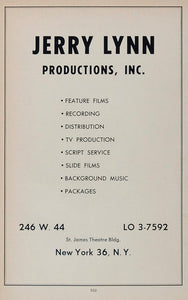 This is an original 1958 print ad for Jerry Lynn Productions, Inc. offering many film services, including feature films, recording, distribution, TV production, script service, slide films, background music, and packages.