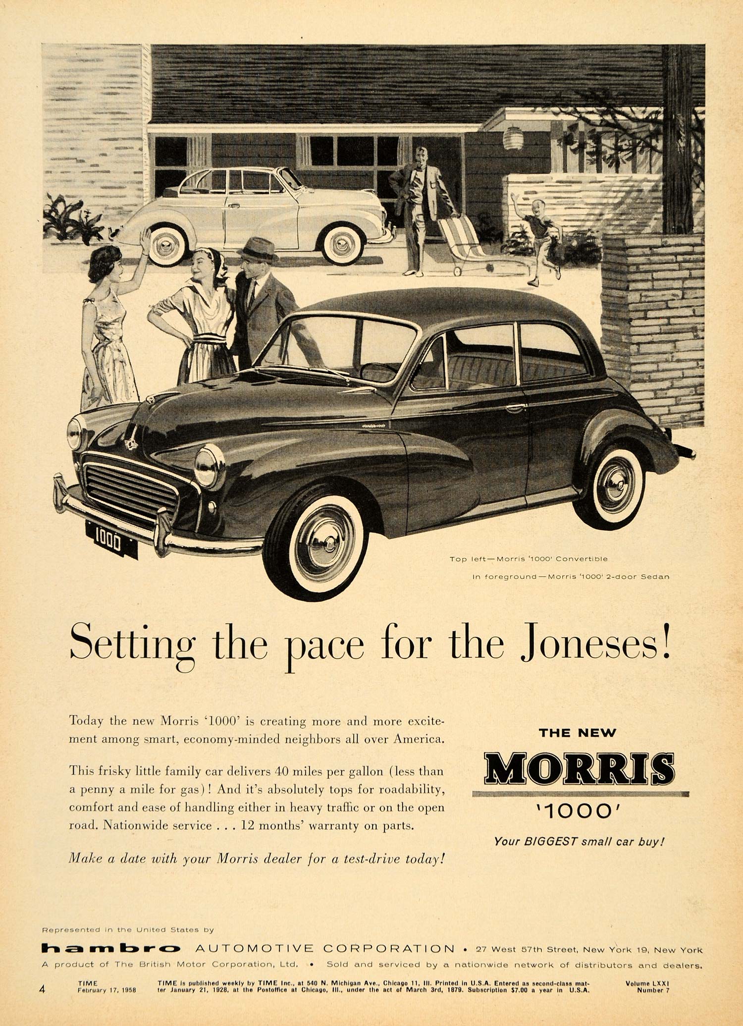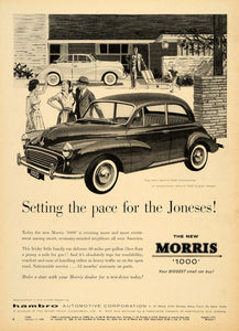 This is an original 1958 black and white print ad for the New Morris 1000 Sedan and Convertible.