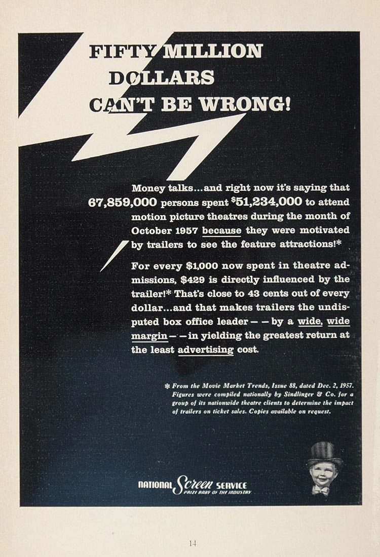 This is an original 1958 black and white print ad for the National Screen Service. The ad points out that "67,859,000 persons spent $51,234,000 to attend motion picture theatres during the month of October 1957 because they were motivated by trailers to see the feature attractions!"