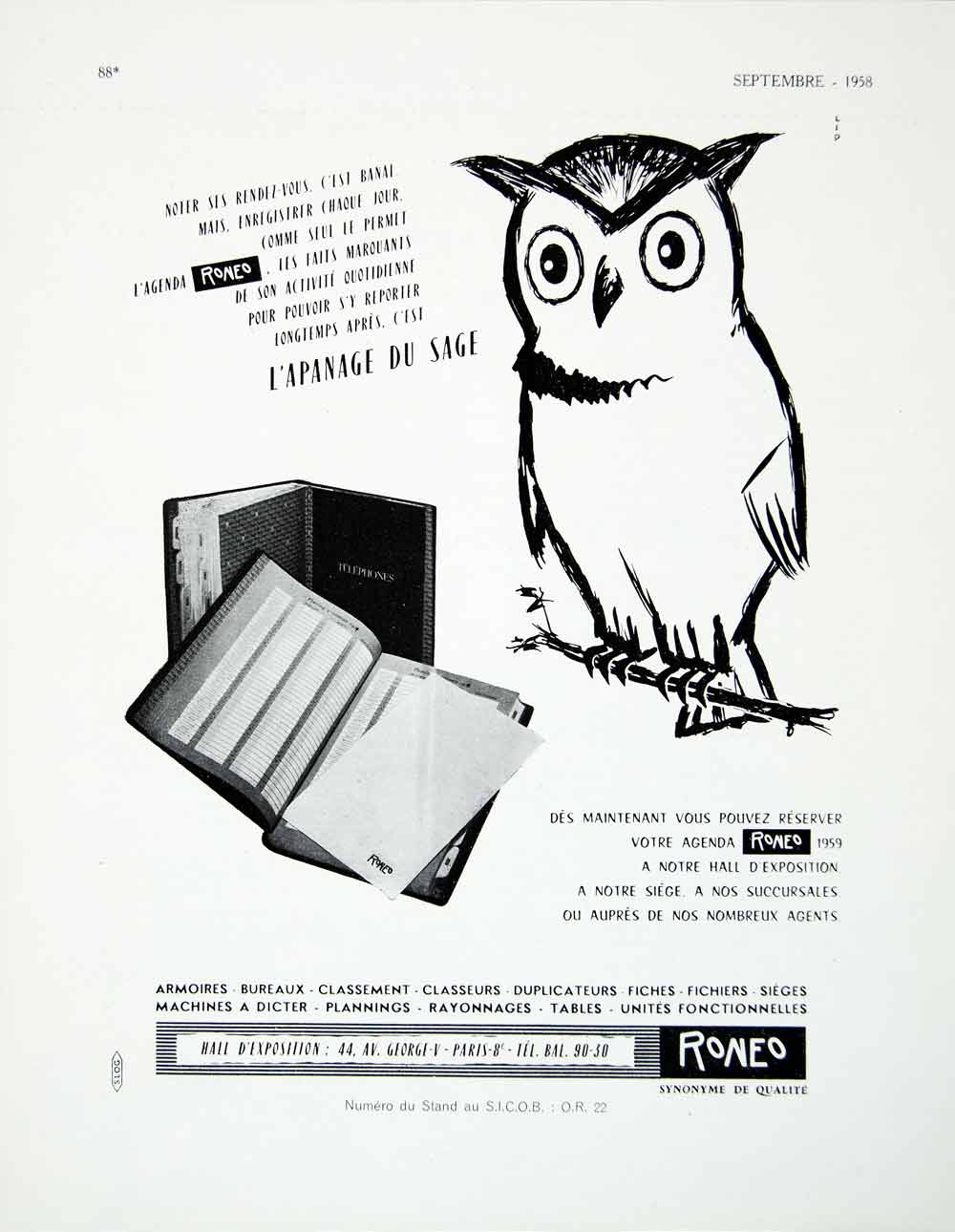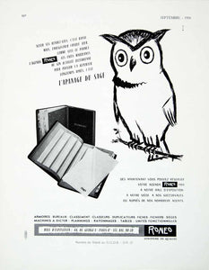 1958 Ad Owl Roneo French Office Supplies Agenda Daily Planner Bird VEN1