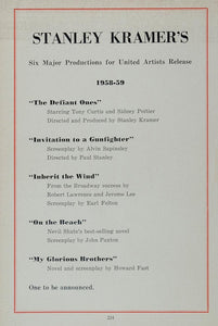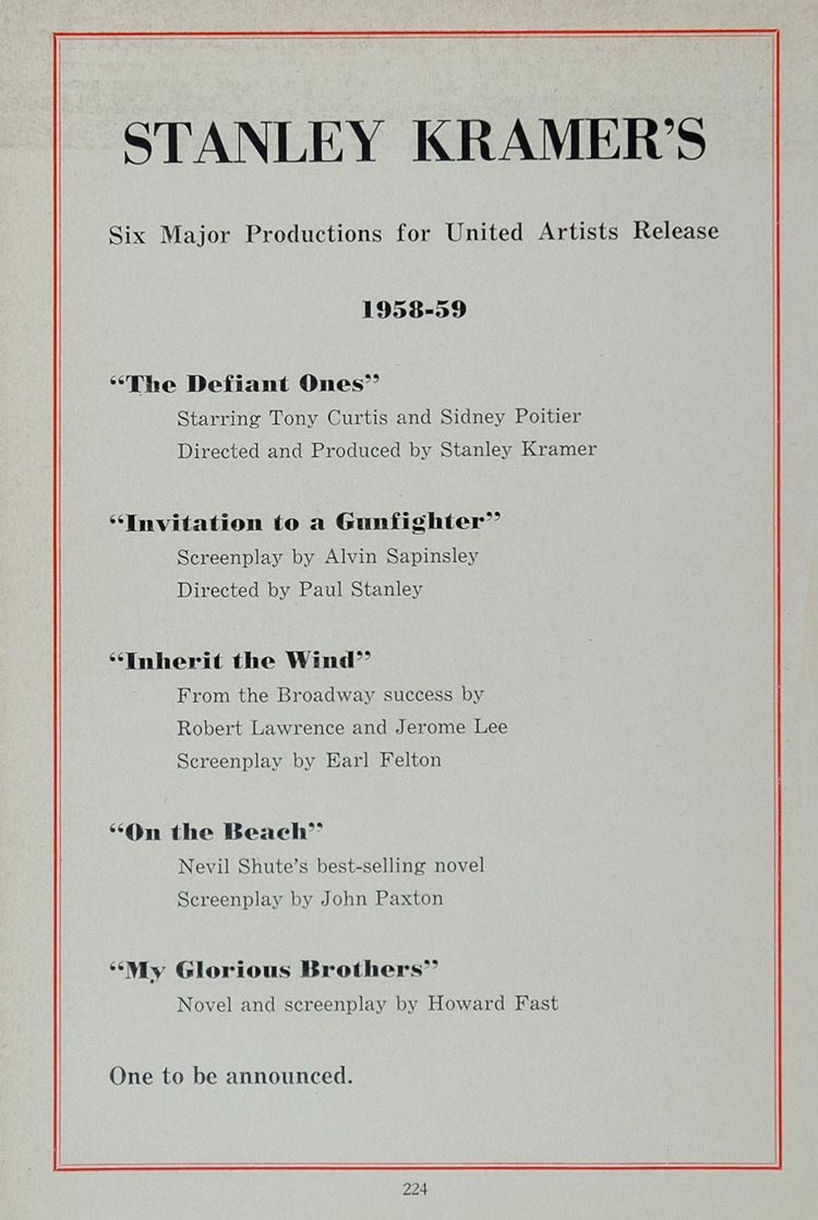 This is an original 1958 two color print ad for Stanley Kramer's six major productions for United Artists release in 1958-59 which include "The Defiant Ones," "Invitation to a Gunfighter," "Inherit the Wind," "On the Beach," and "My Glorious Brothers," plus one to be announced.