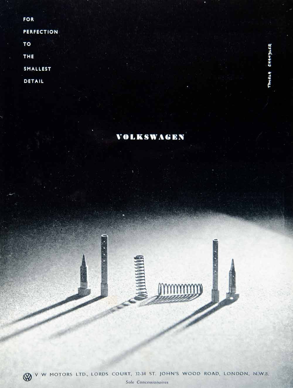 This is an original 1958 black and white print ad for Volkswagen autos that were made and sold by VW Motors Ltd., of Lords Court, 32-34 St. John's Wood Road, London, England.