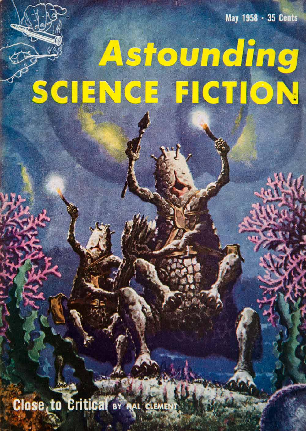 This is an original color cover for Astounding Science Fiction, May, 1958 that featured artwork of raging Tenebrans from the serialized novel, Close to Critical by author Hal Clement.