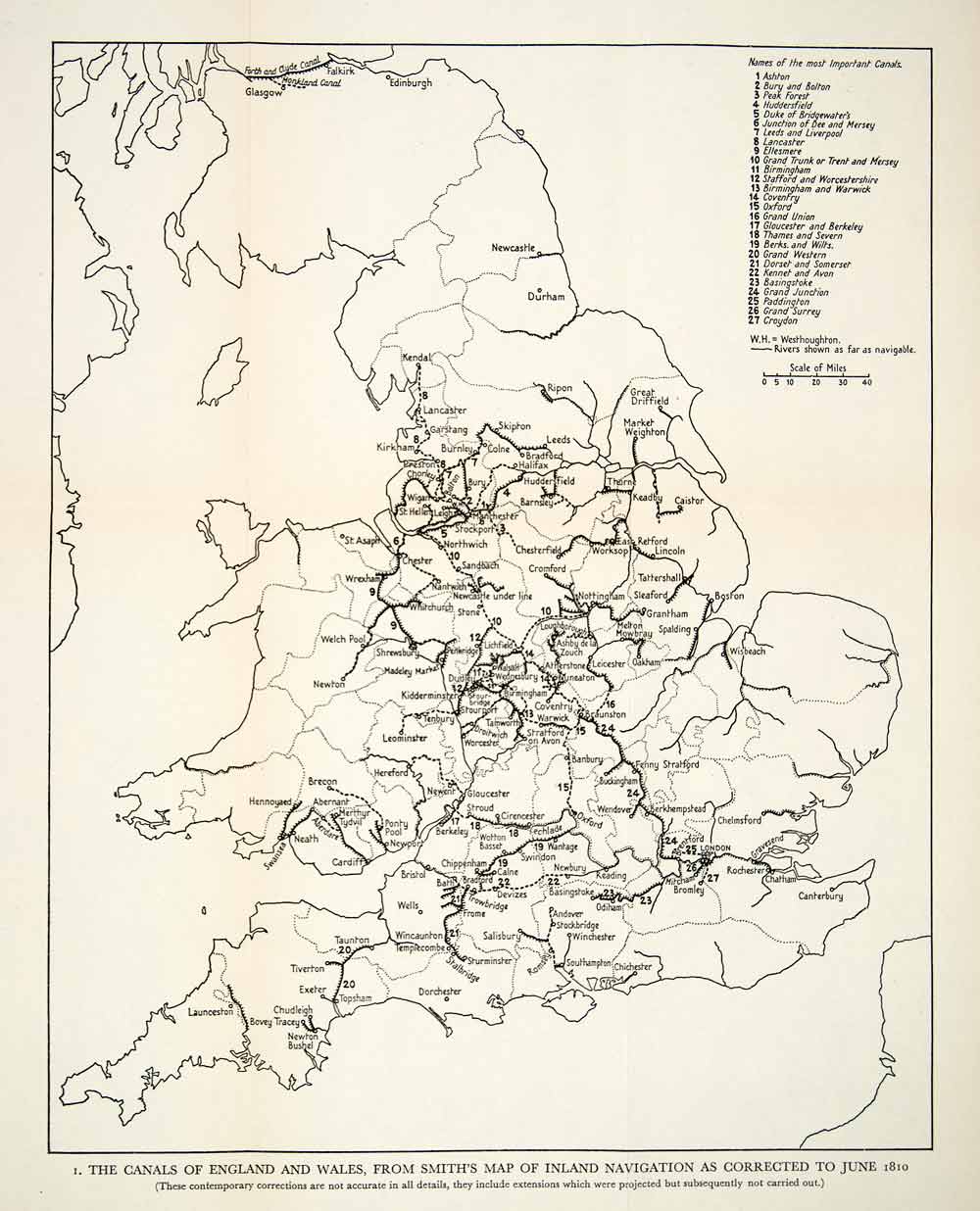 1958 Print Map England Wales United Kingdom Britain Canals Route Ashton XEQ1