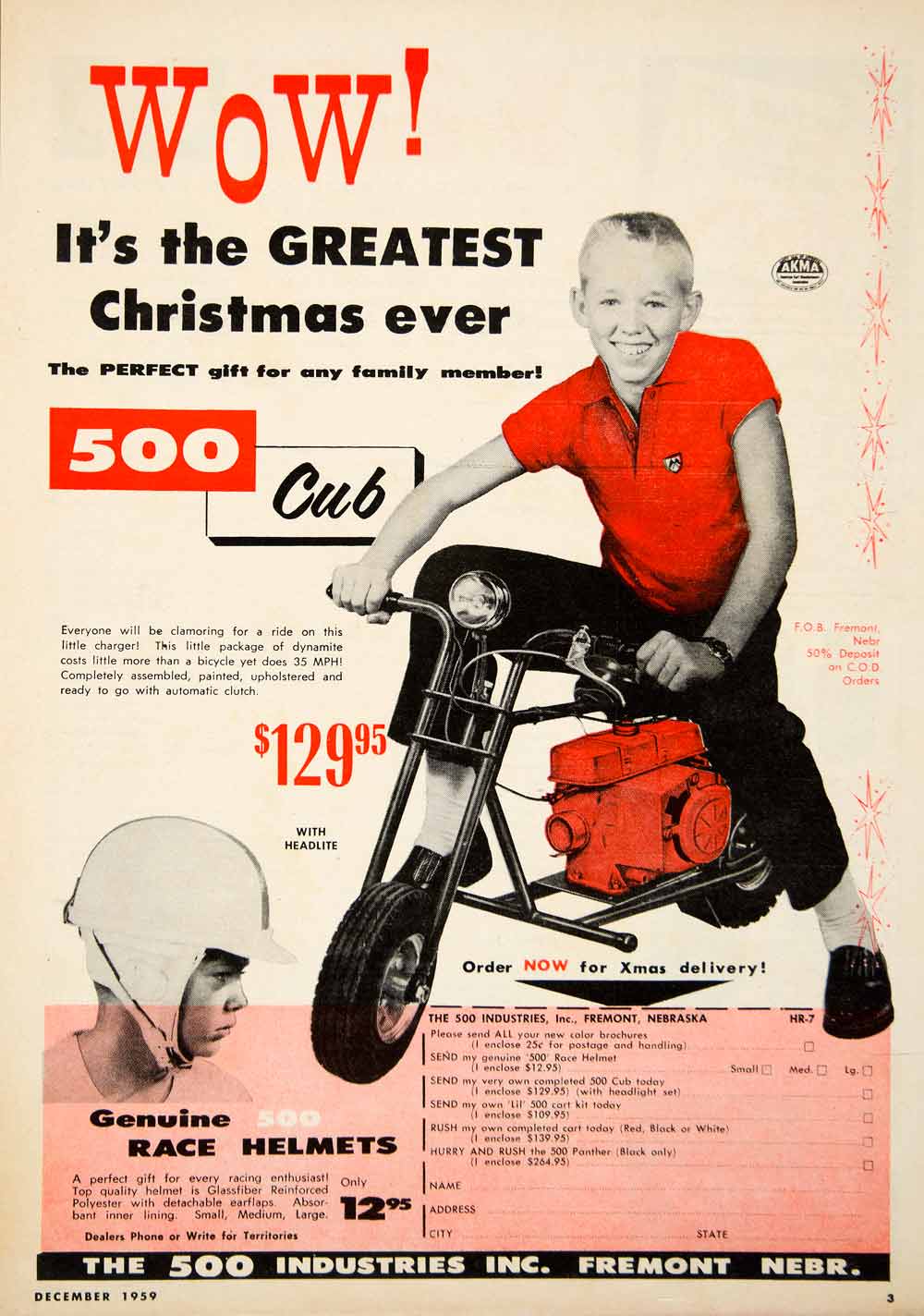 This is an original 1959 two-color print ad for the 500 Cub child's racing bike, from the 500 Industries, Inc., in Fremont, Nebraska.
