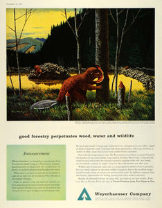 This is an original 1959 color print ad for lumber, plywood, wood pulp, paperboard, shipping containers, folding boxes, milk cartons, hardboard, particle board, Ply-Veneer, bark and wood fiber products by Weyerhaeuser Company, formerly Weyerhaeuser Timber Company,