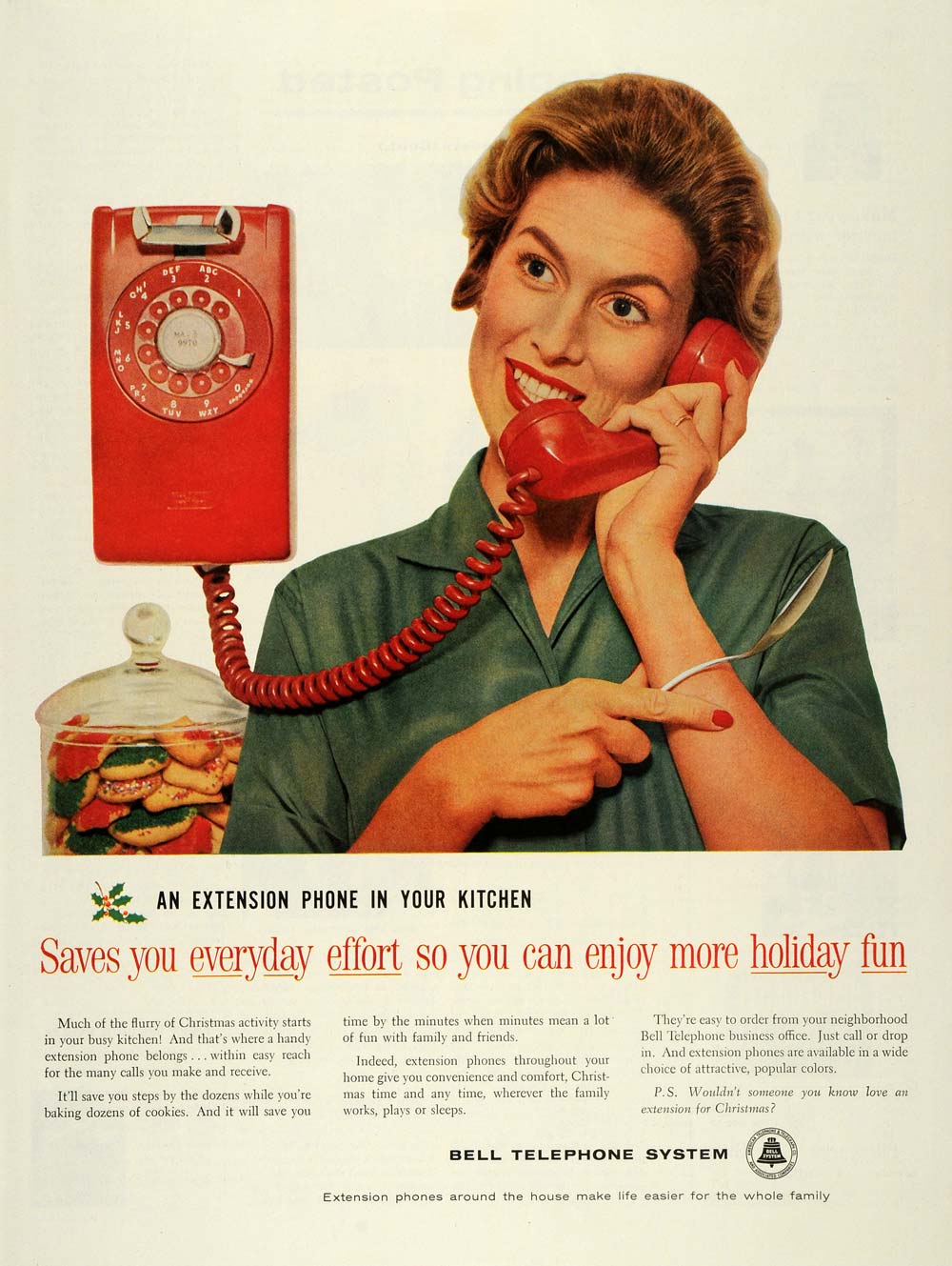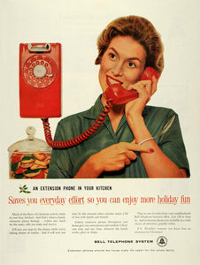 This is an original 1959 color print ad for the Bell Telephone System extension kitchen phones by the American Telephone & Telegraph Company.