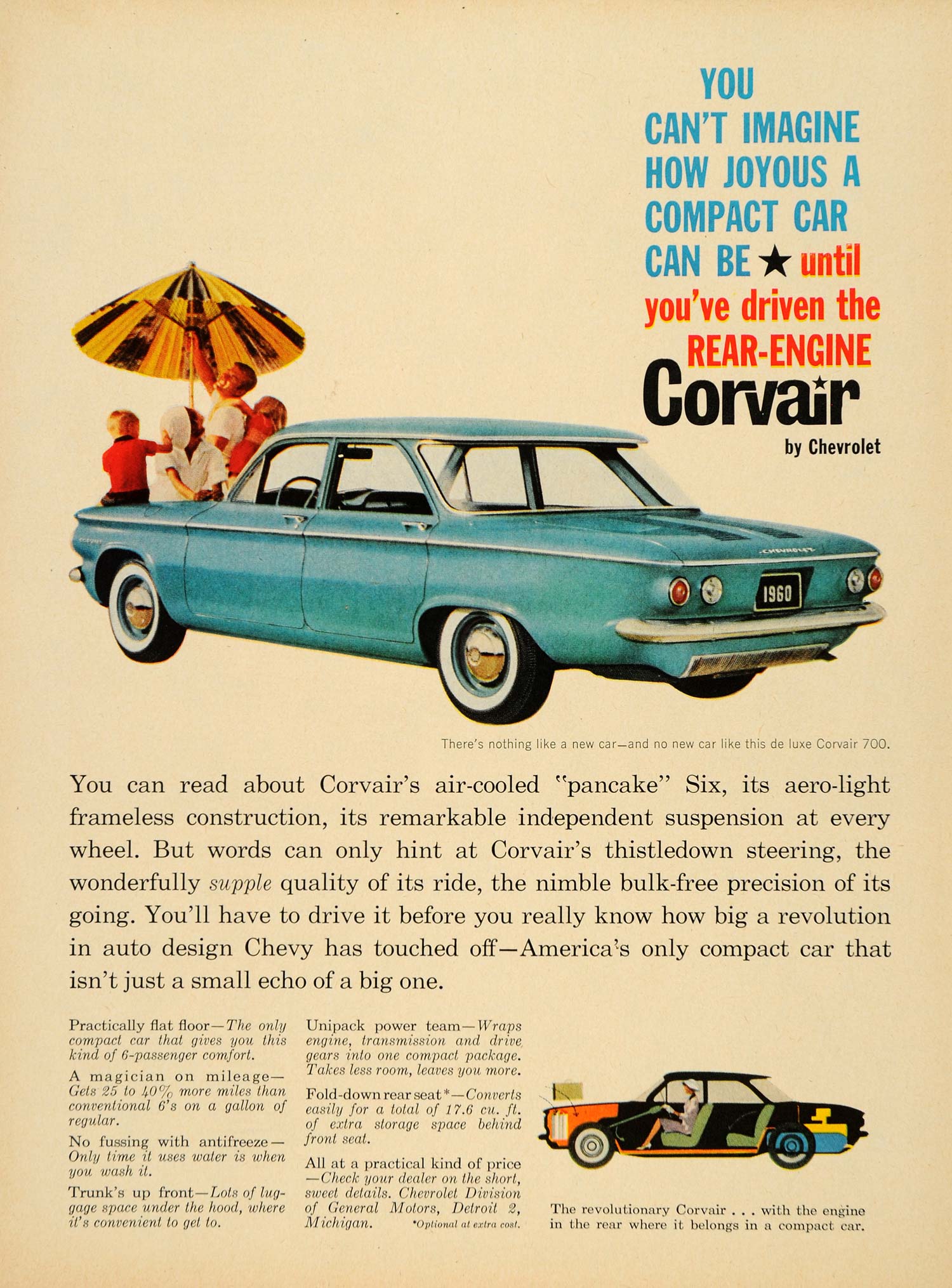 Keywords specific to this image: Car Features, Car Mileage, De luxe Corvair 700, GM, General Motors, Detroit Michigan, Front Trunk, Antifreeze, Car Enthusiasts, Chevy Vintage Advertising
