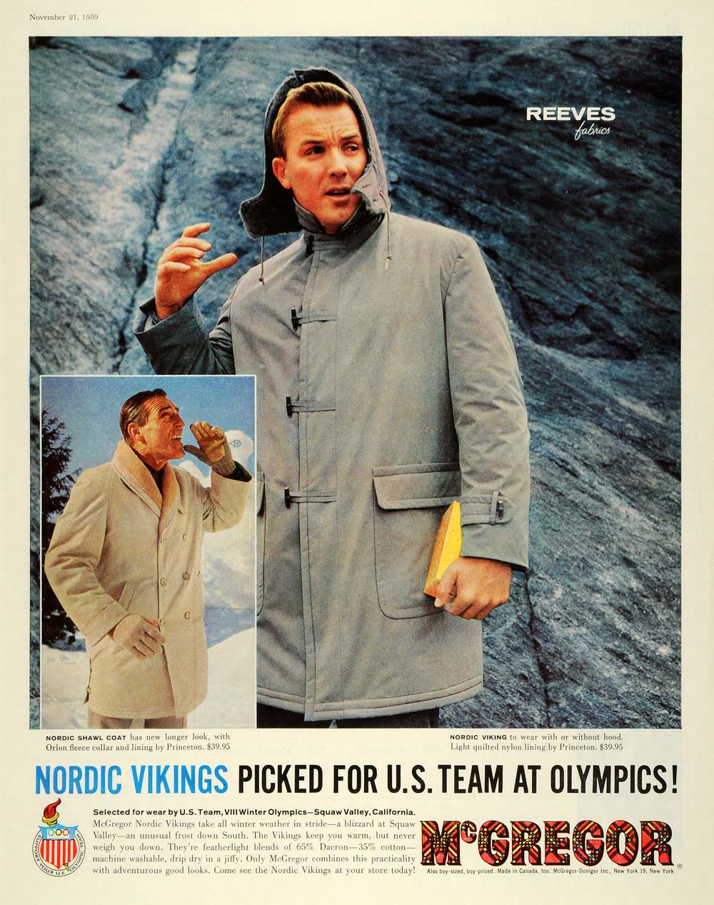 This is an original 1959 color print ad for McGregor Nordic Vikings coats made with Reeves fabrics. These jackets were picked to be worn by the United States team for the VIII Winter Olympics in Squaw Valley, California.
