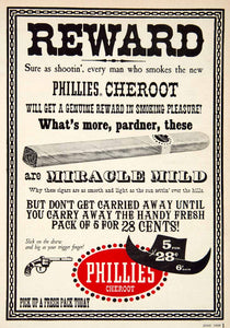 This is an original 1959 two-color print ad for Phillies Cheroot cigars that were "slick on the draw and big as your trigger finger". Yipee-ki-yah!