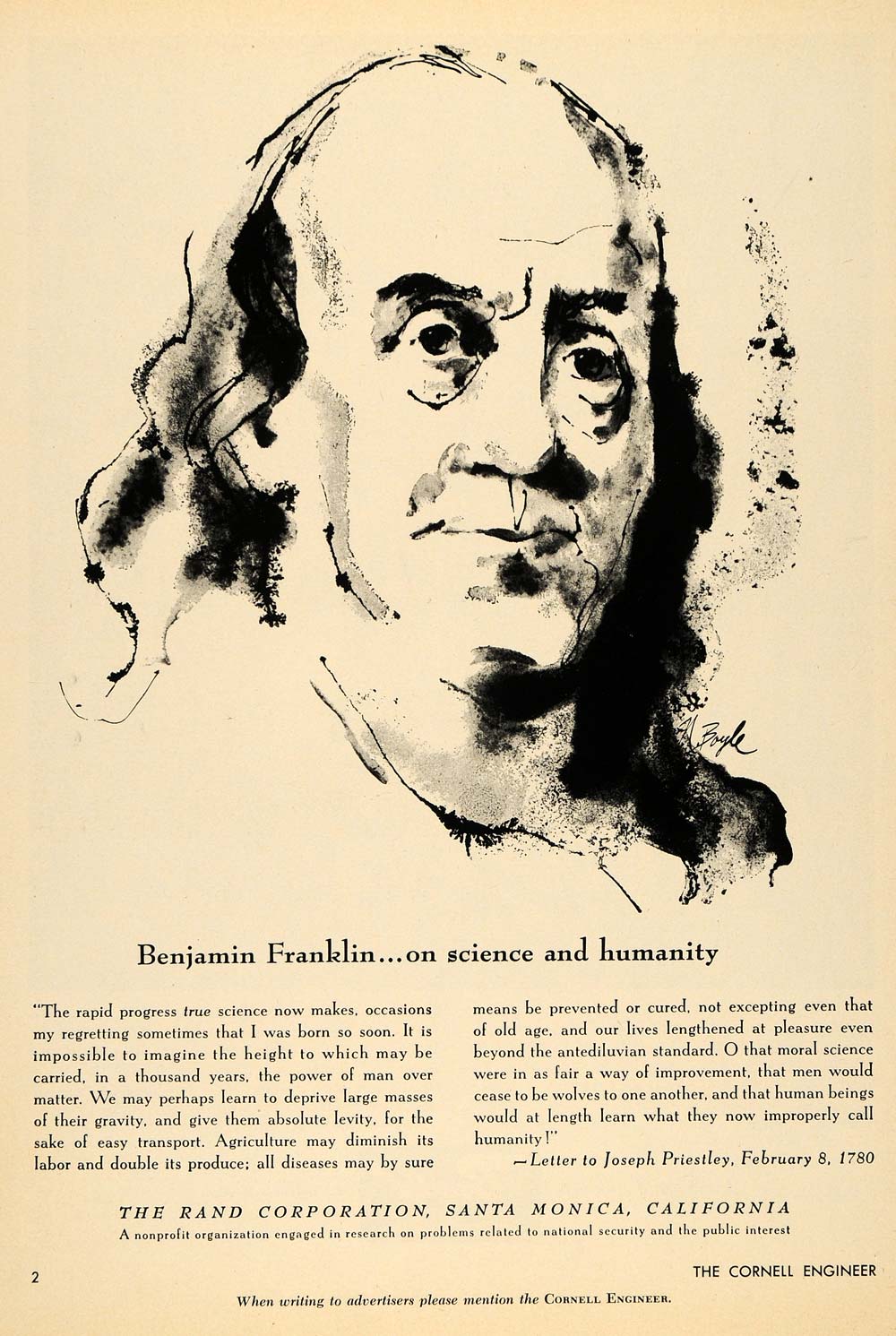 This is an original 1959 black and white print ad for the Rand Corporation of Santa Monica, California; this nonprofit organization specializes in national security and public interest. The portrait of Benjamin Franklin is done by the artist N. Boyle.