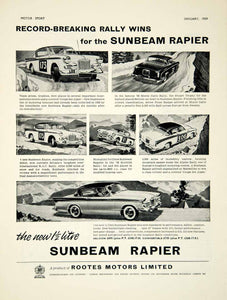 This is an original 1959 black and white print ad for the 1959 Sunbeam Rapier automobiles that were made and sold by Rootes Motors Limited and Sunbeam-Talbot Ltd. of Coventry, England. The ad also features illustrations of the Sunbeam Rapier winning the 1958 Monte Carlo Rally race.
