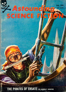 This is an original color cover for Astounding Science Fiction, February 1959, that featured artwork of a intergalactic buccaneer from author Murray Leinster's story entitled, The Pirates of Ersatz.