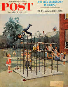 This is an original 1959 color cover for the November issue of The Saturday Evening Post, featuring an image by George Hughes of a boy preoccupied with showing off his jungle gym acrobatics to his crush during recess.CONDITION