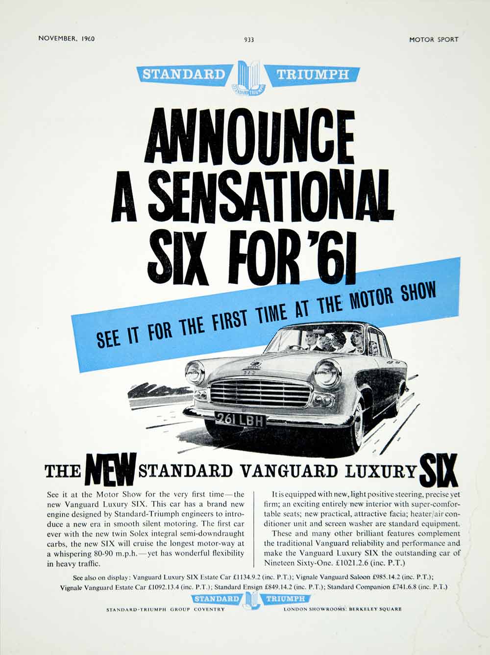 This is an original 1960 two-color print ad for the 1961 Standard Vanguard Six four-door saloon luxury cars that were made and sold by the Standard-Triumph Group of Coventry, England.