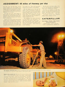 Keywords specific to this image: Machines That Build For A Growing America, Peoria Illinois, Superhighway, National System of Interstate and Defense Highways, Tractors, Big Yellow Cat, Robert, Farming, Electric Power Vintage Advertising