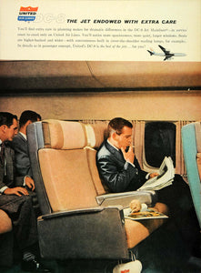 This is an original 1960 color print ad for DC-8 Jet Mainliner from United Airlines founded in Boise, Idaho. This has extra care, with extra special additives to make your flying experience even better. Over the shoulder reading lamps, larger windows and wider seats.