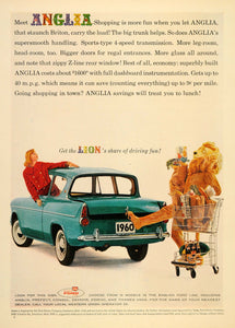 This is an original 1960 color print ad for the Anglia automobile from the English Ford Line made in England for the Ford Motor Company located in Dearborn, Michigan. This is an excellent original print item for the collector of this vintage car!