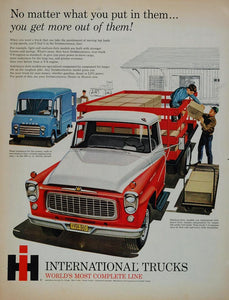 This is an original l960 color print ad for International trucks, including a blue Metro-Mite delivery van and a red medium-duty model, from the International Harvester Company.