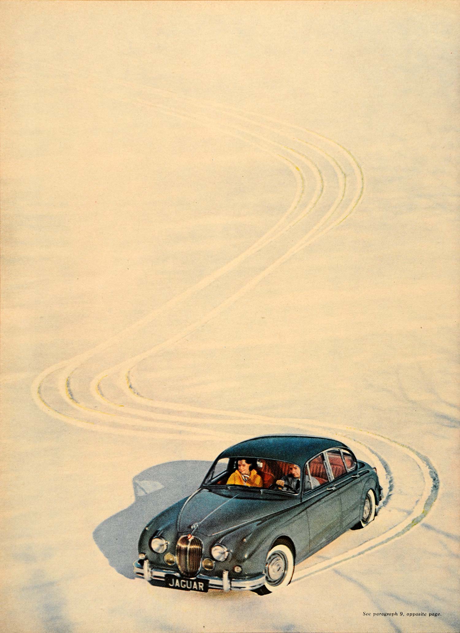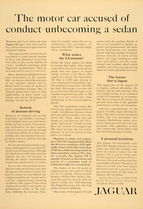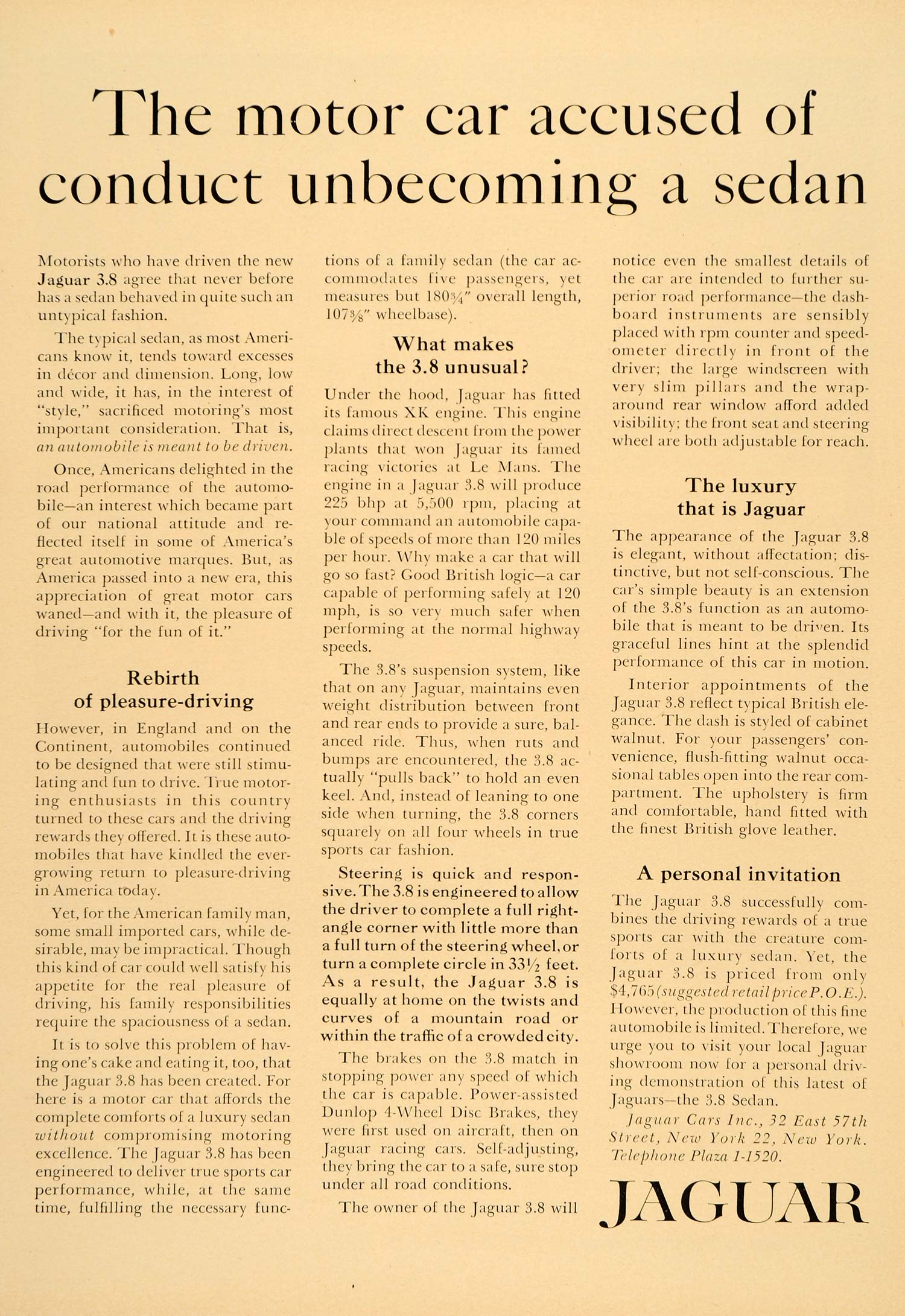 This is an original 1960 color two-page print ad for the Jaguar 3.8. The ad writes, "The motor car accused of conduct unbecoming a sedan".