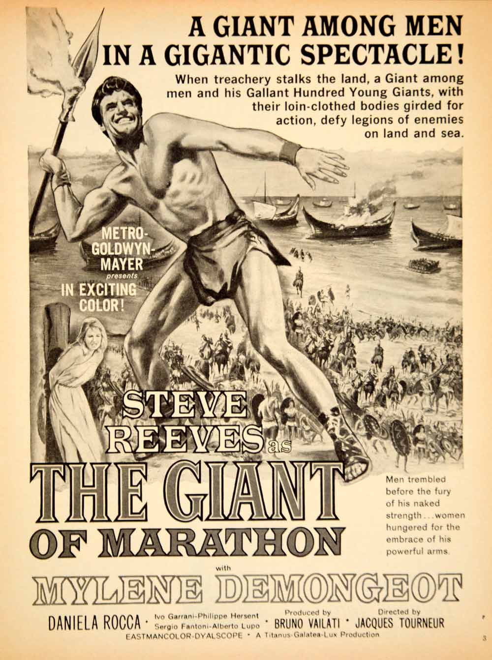 This is an original 1960 black and white print ad for the 1959 Italian movie "The Giant of Marathon" ("La battaglia di Maratona") directed by Jacques Tourneur and starring Steve Reeves, Mylne Demongeot, Daniela Rocca, and Sergio Fantoni. Produced by Bruno Vailati.
