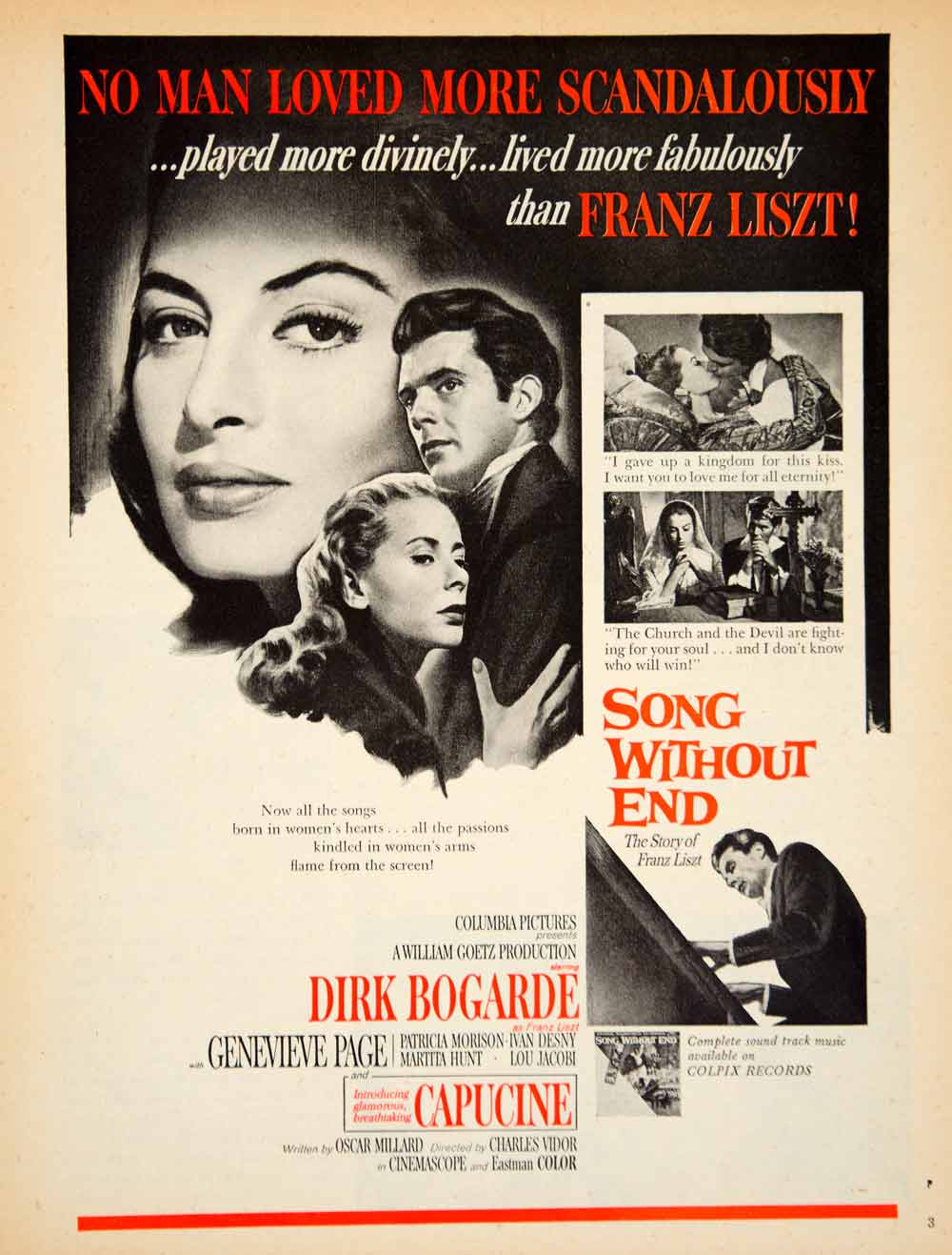 This is an original 1960 two-color print ad for the 1960 Columbia Pictures movie "Song Without End," directed by Charles Vidor and starring Dirk Bogarde, Capucine, and Genevive Page; written by Oscar Millard. A William Goetz Production.