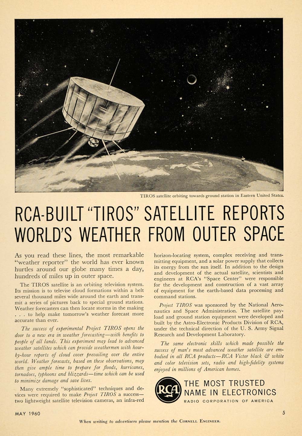 This ad illustrates an image of the Model of TIROS satellite orbiting towards ground station in Eastern United States.
