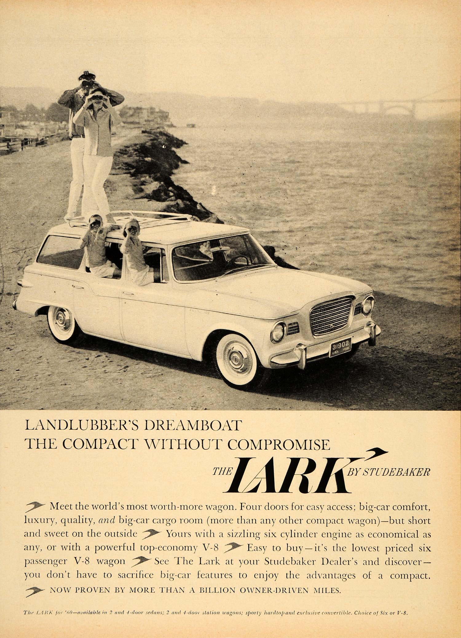 Keywords specific to this image: Seaside, Ocean, Sightseeing, Travel, Captain Hat, Golden Gate Bridge, Sedan, Sporty Hardtop, Exclusive Convertible, Two-Door, Four-Door, Binoculars Vintage Advertising