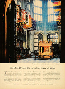 This is an original 1960 color print ad for British Travel Association located at 680 Fifth Avenue in New York. Pictured in the ad is Henry VII's chapel in Westminster Abbey in London, England. Elizabeth I and Mary Queen of Scots are also buried in the chapel.