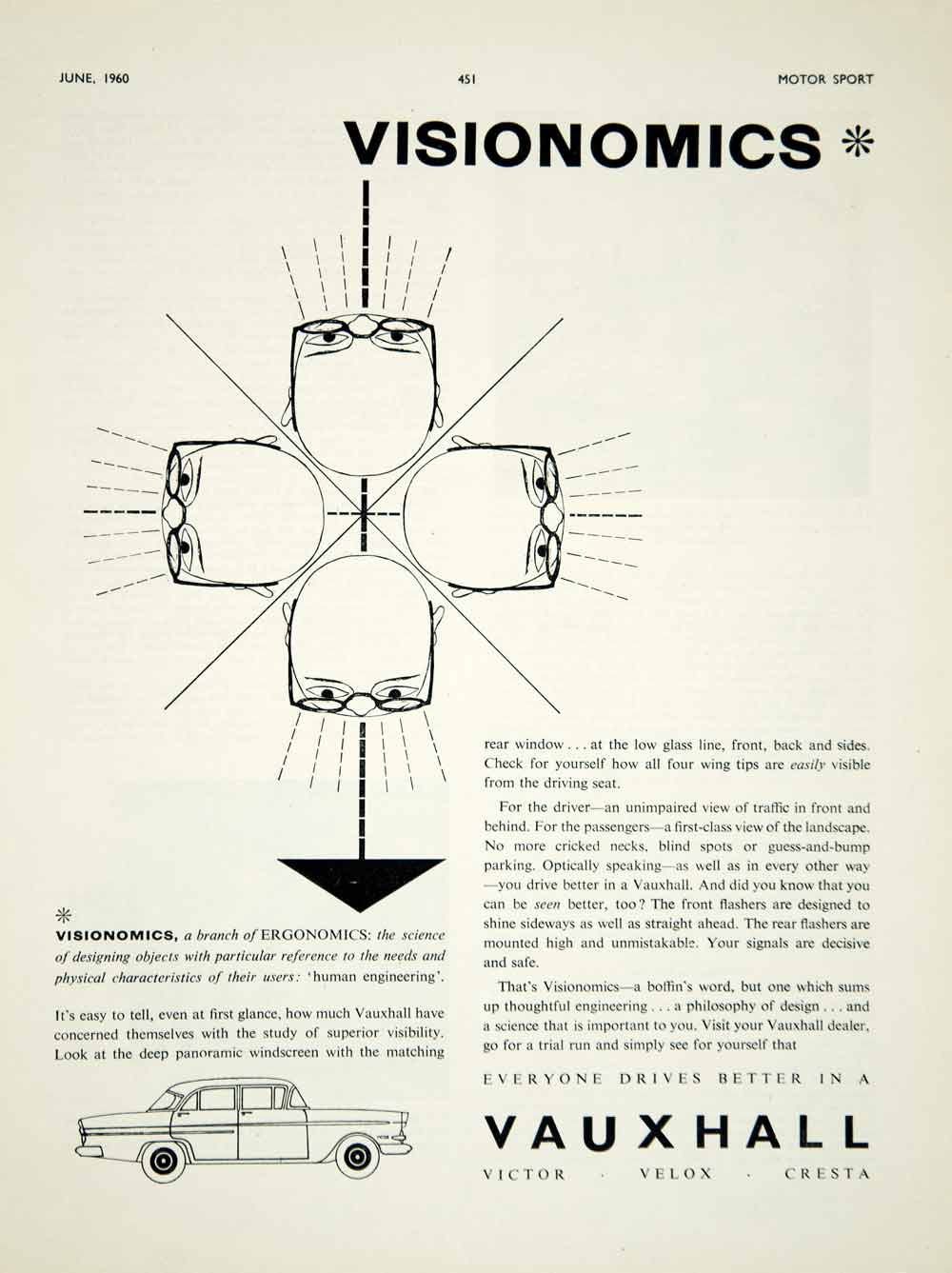 This is an original 1960 two-color print ad for the "visionomics" automotive engineering philosophy of Vauxhall Motors of the United Kingdom (UK).