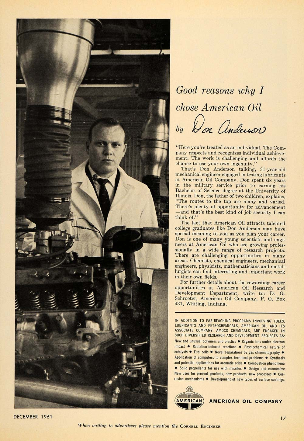 This ad features an image of Don Anderson, a mechanical engineer engaged in testing lubricants at American Oil Company.