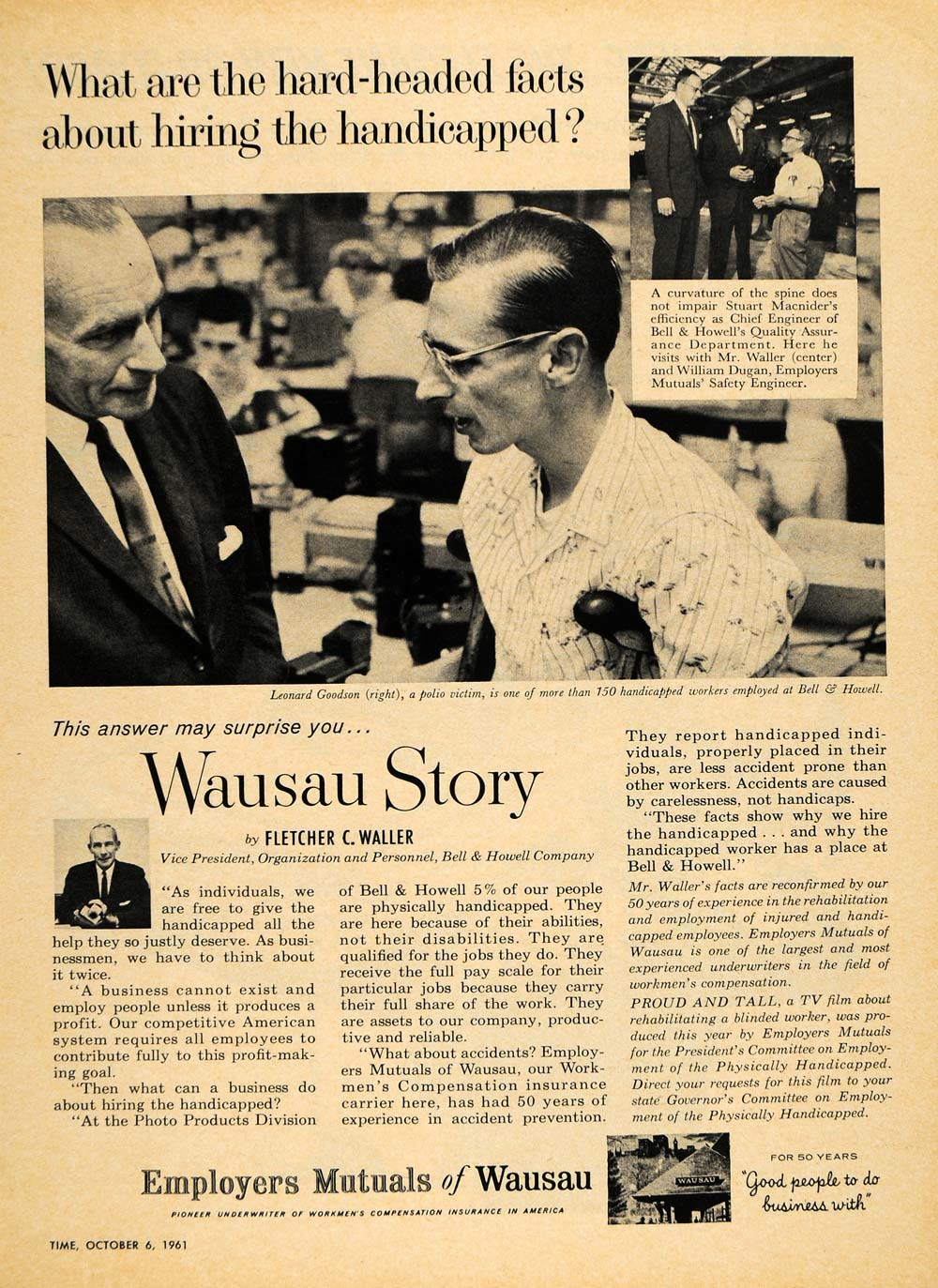 Keywords specific to this image: Vintage Advertising, workmen's compensation insurance, hiring handicapped, employers, employees, Stuart Macnider, Leonard Goodson, polio victim
