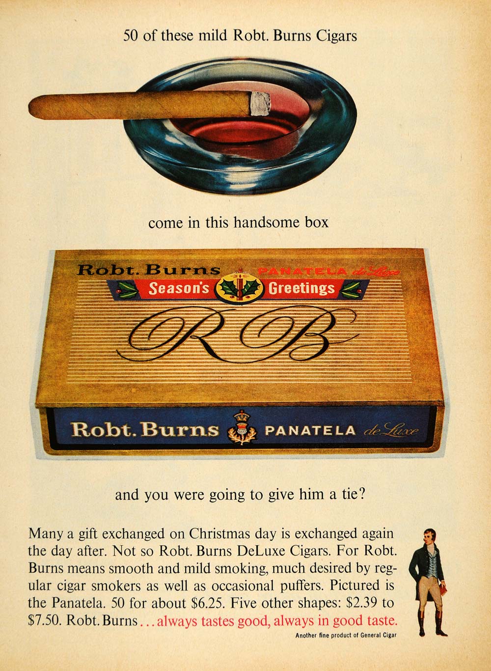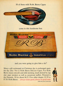 This is an original 1961 color print ad for Robt. Burns Panatela de Luxe cigars in the Season's Greetings box.
