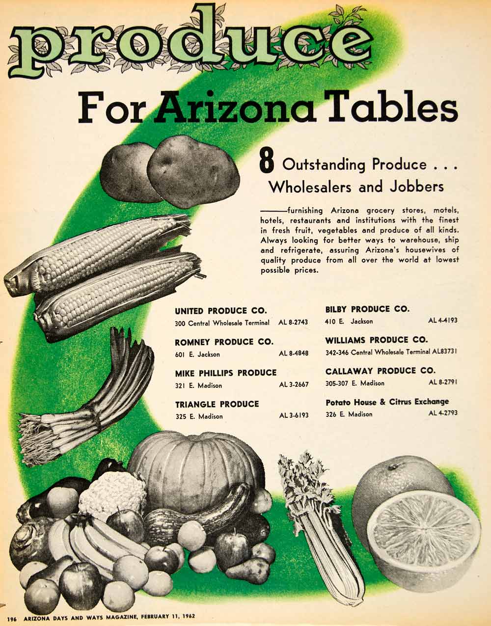 This is an original 1962 color print ad for "Eight Produce Wholesalers and Jobbers." Listed at that time are United Produce Co., Romney Produce Co., Mike Phillips Produce, Triangle Produce, Bilby Produce Co., Williams Produce Co., Callaway Produce Co., Potato House & Citrus Exchange.