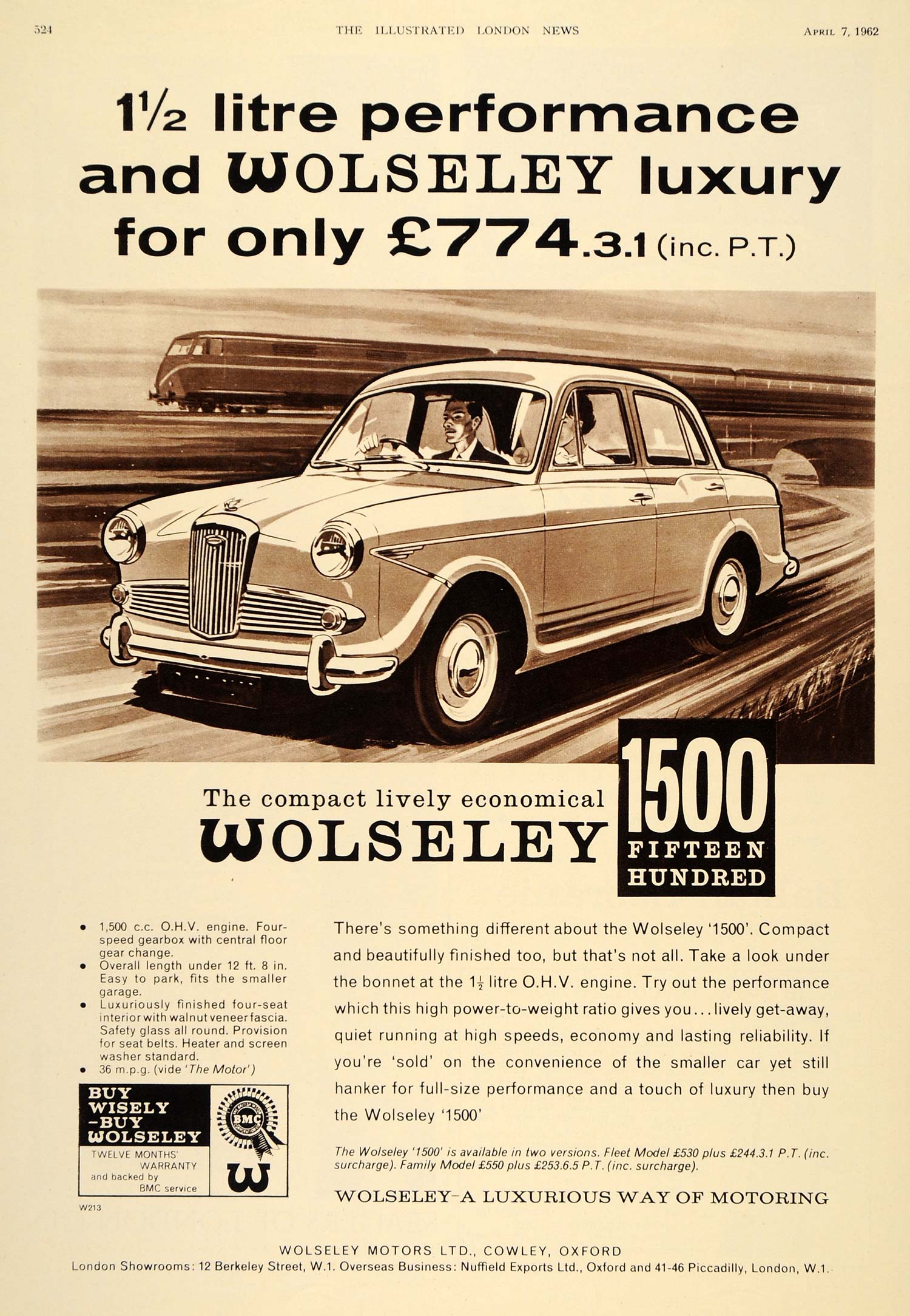 This is an original 1962 print ad for the Wolseley 1500 1.5 litre car, available in the Fleet and the Family models, from Wolseley Motors Limited, Cowley, Oxford, England, a part of the British Motor Corporation (BMC).