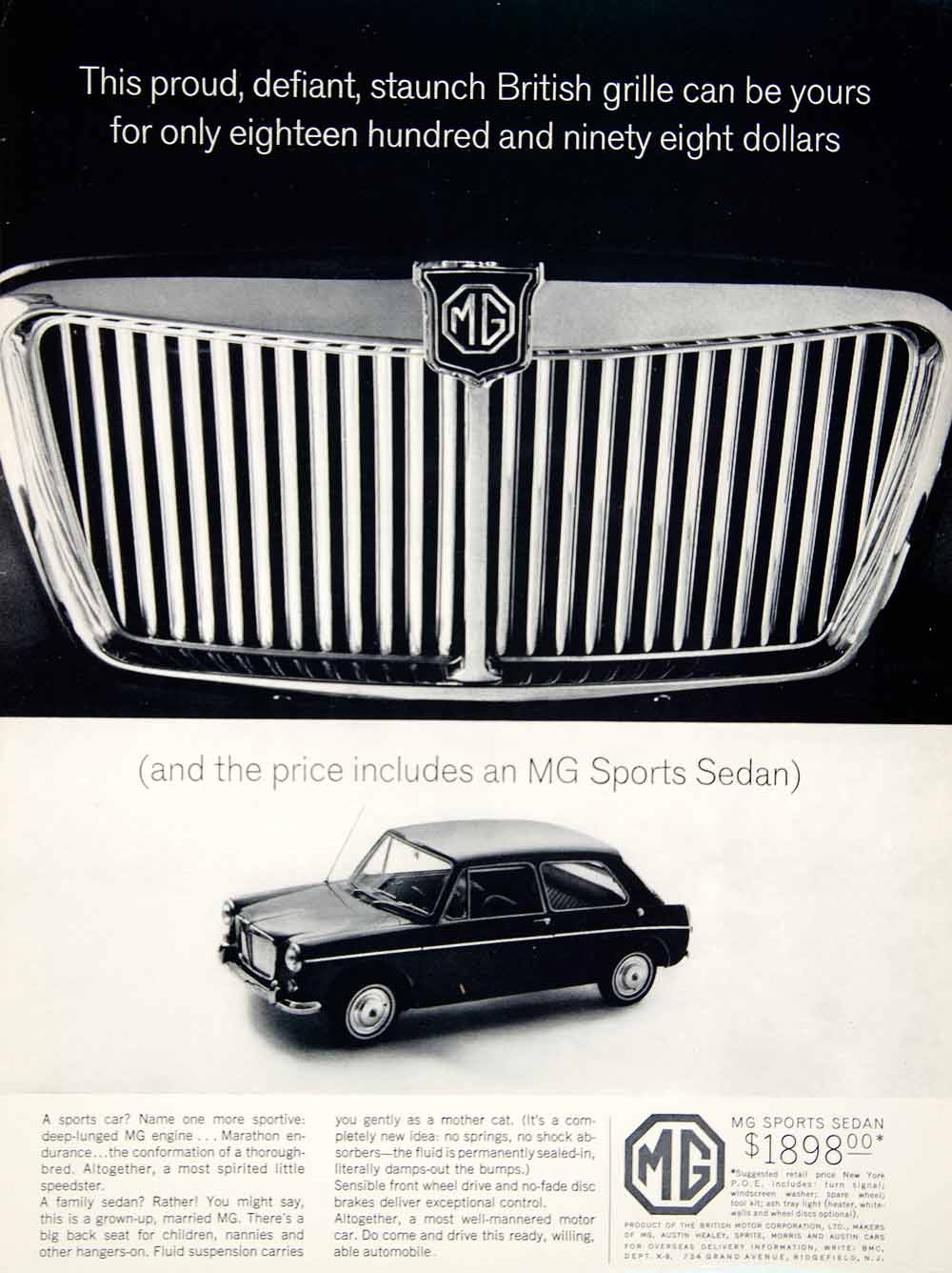 This is an original 1963 black and white print ad for the 1964 MG Sports Sedan family car that was made and sold by the British Motor Corporation, Ltd.