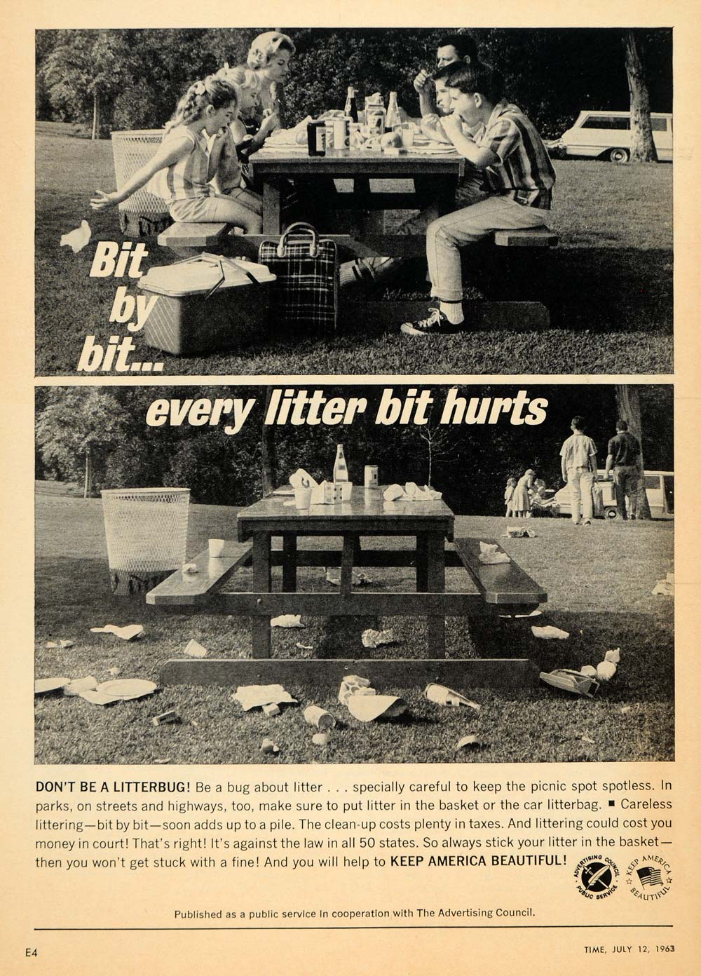 This is an original 1963 black and white print ad for a public service announcement sponsored by The Advertising Council to keep America beautiful by not littering.