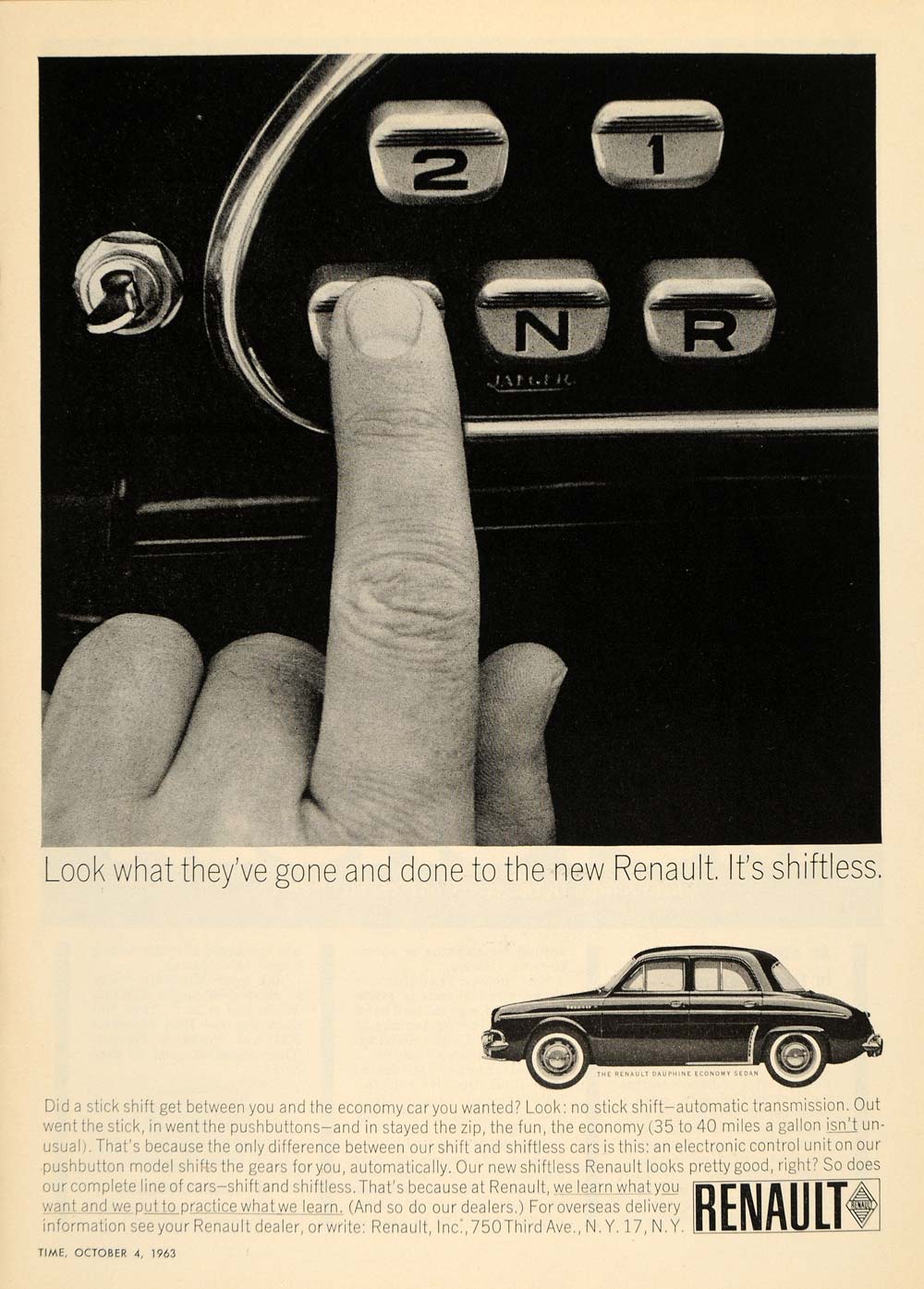 This is an original 1963 black and white print ad for the Renault Dauphine Economy Sedan.