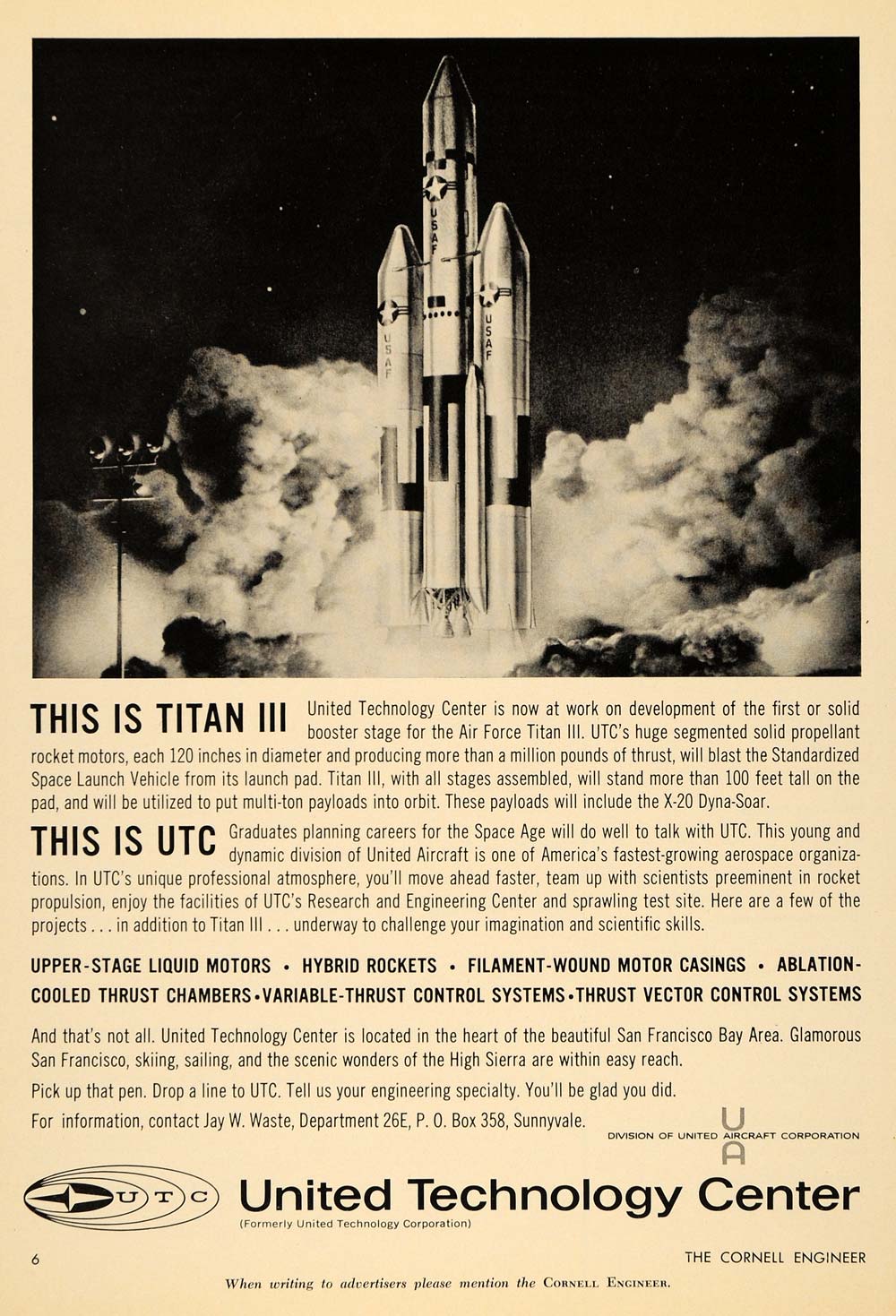 This is an original 1963 black and white print ad for the United Technology Center, a Division of United Aircraft Corporation.