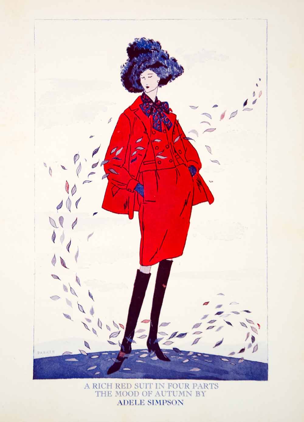 This is an original 1963 color print ad for a gorgeous red suit for autumn by fashion designer, Adele Simpson.
