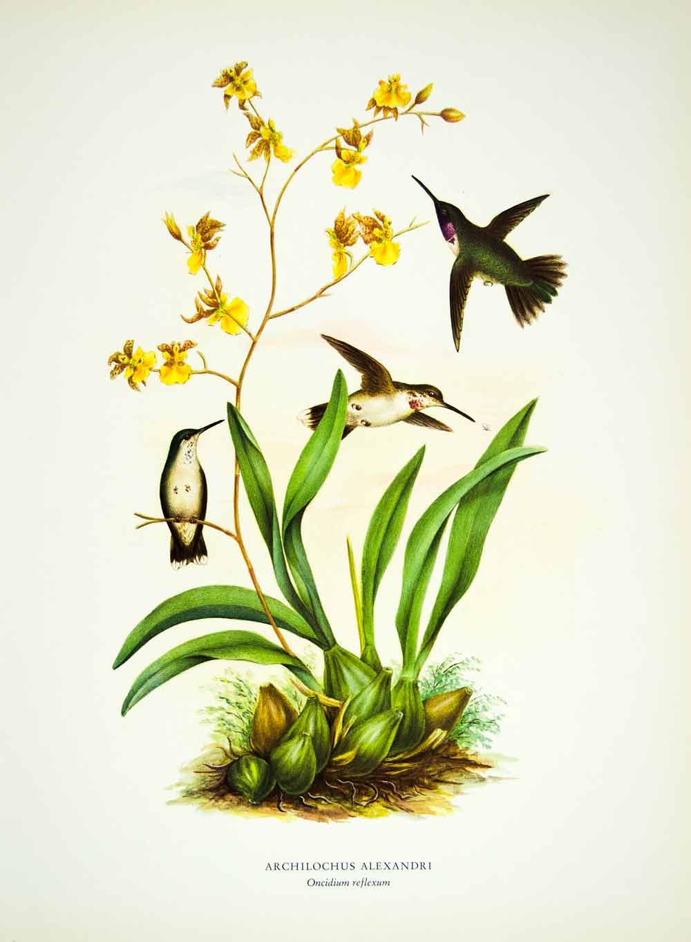 This is an original 1963 color print by Rafael Montes de Oca of a small group of Archilochus Alexandri, known more commonly as the Black-Chinned Hummingbird. With an average length of 81 mm., the throat of these birds is black, with a deep purple tail, with pointed feather tips, white in the female. The Black-chinned Hummingbird breeds in the United States, but has been seen as far south as the Mexican frontier states. The pictured orchid is known as Oncidium Reflexum, commonly known as the Back-Bent Oncidium. A native of the region of Cordoba and Jalapa in Veracruz, it blooms in early spring.