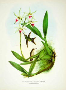 This is an original 1963 color print by Rafael Montes de Oca of two members of the Chlorostilbon Canivetii Auriceps, commonly known as the Golden-crowned Emerald. The orchid pictured is Epidendrum brassavolae, more commonly known as the Brassavola-Like Panarica, is considered rare, and grows around Cordoba, Veracruz, and flowers in January and February.